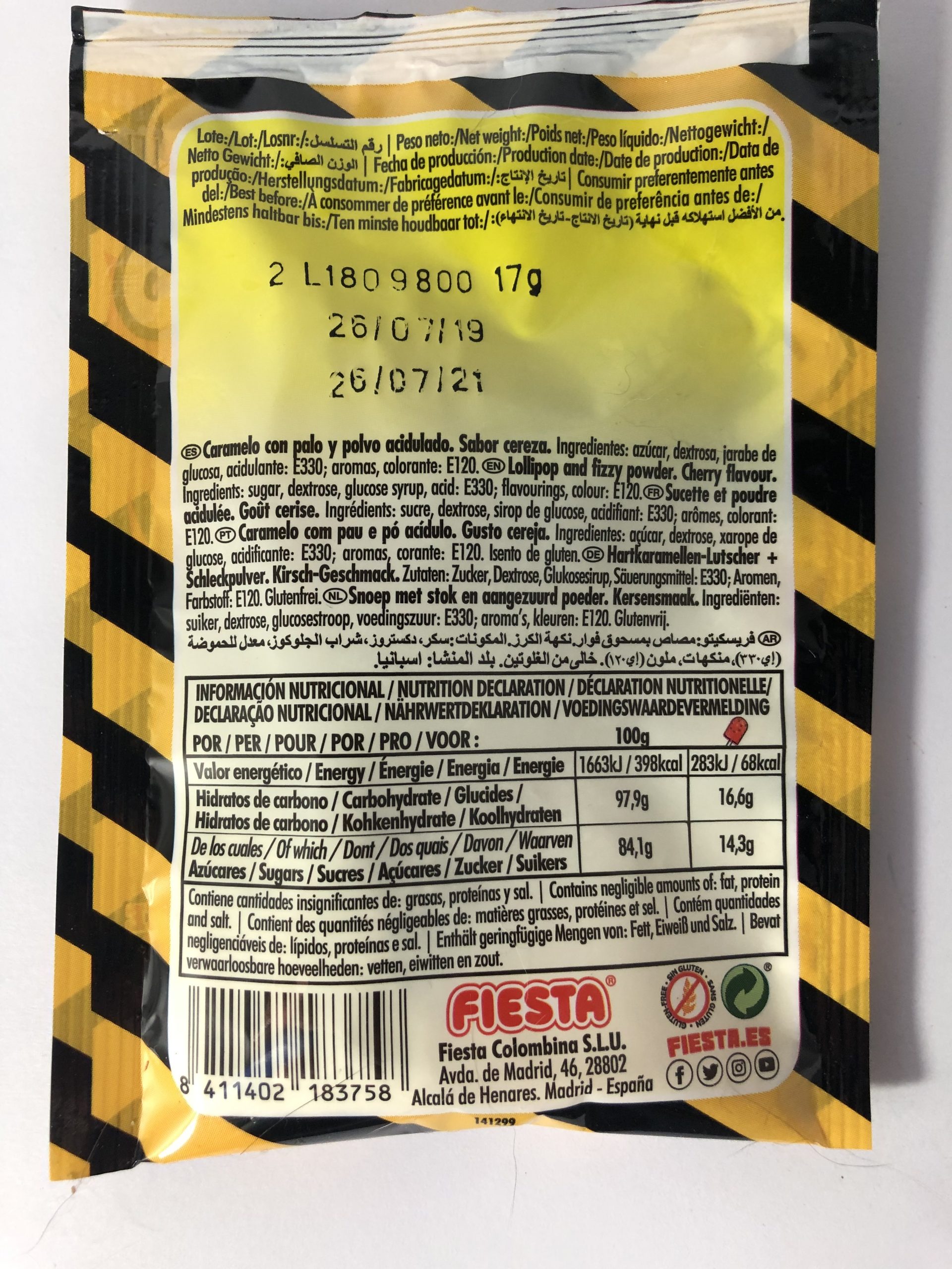 El caramelo con palo Fiesta original para chupar con escalofrío en polvo y sabor a cereza picante.