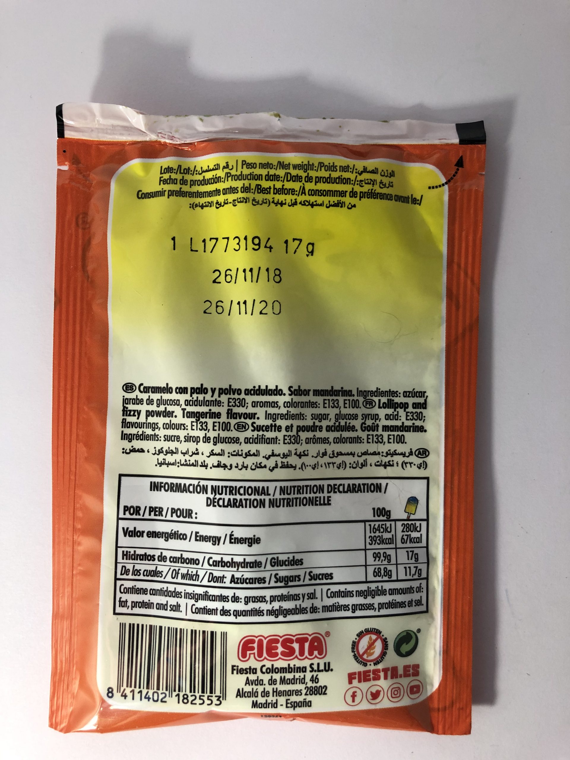 + Free ShippingEl caramelo con palo Fiesta original para chupar con escalofrío en polvo y sabor a mandarina.
