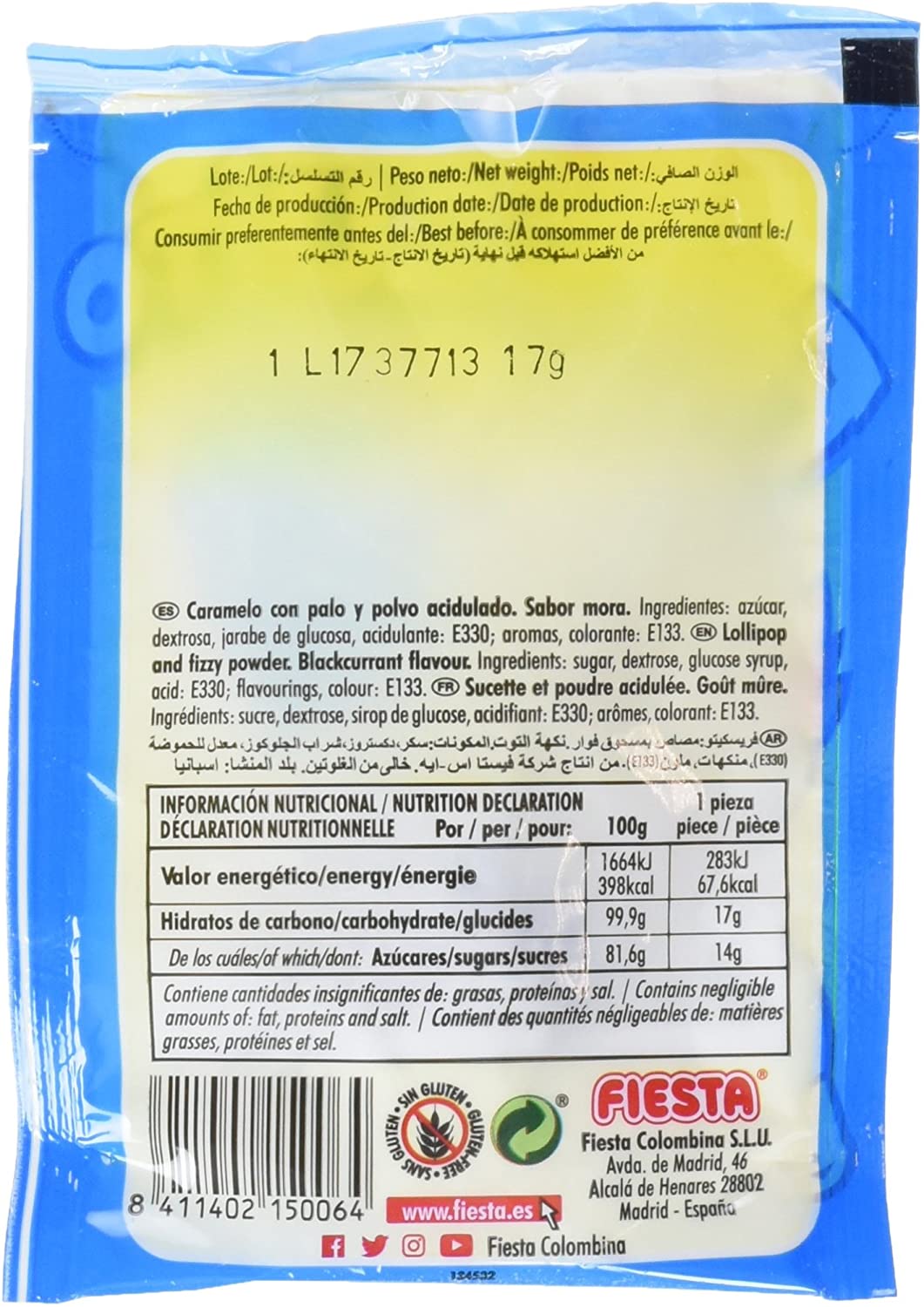 + Free ShippingEl caramelo con palo Fiesta original para chupar con escalofrío en polvo y sabor a mora.