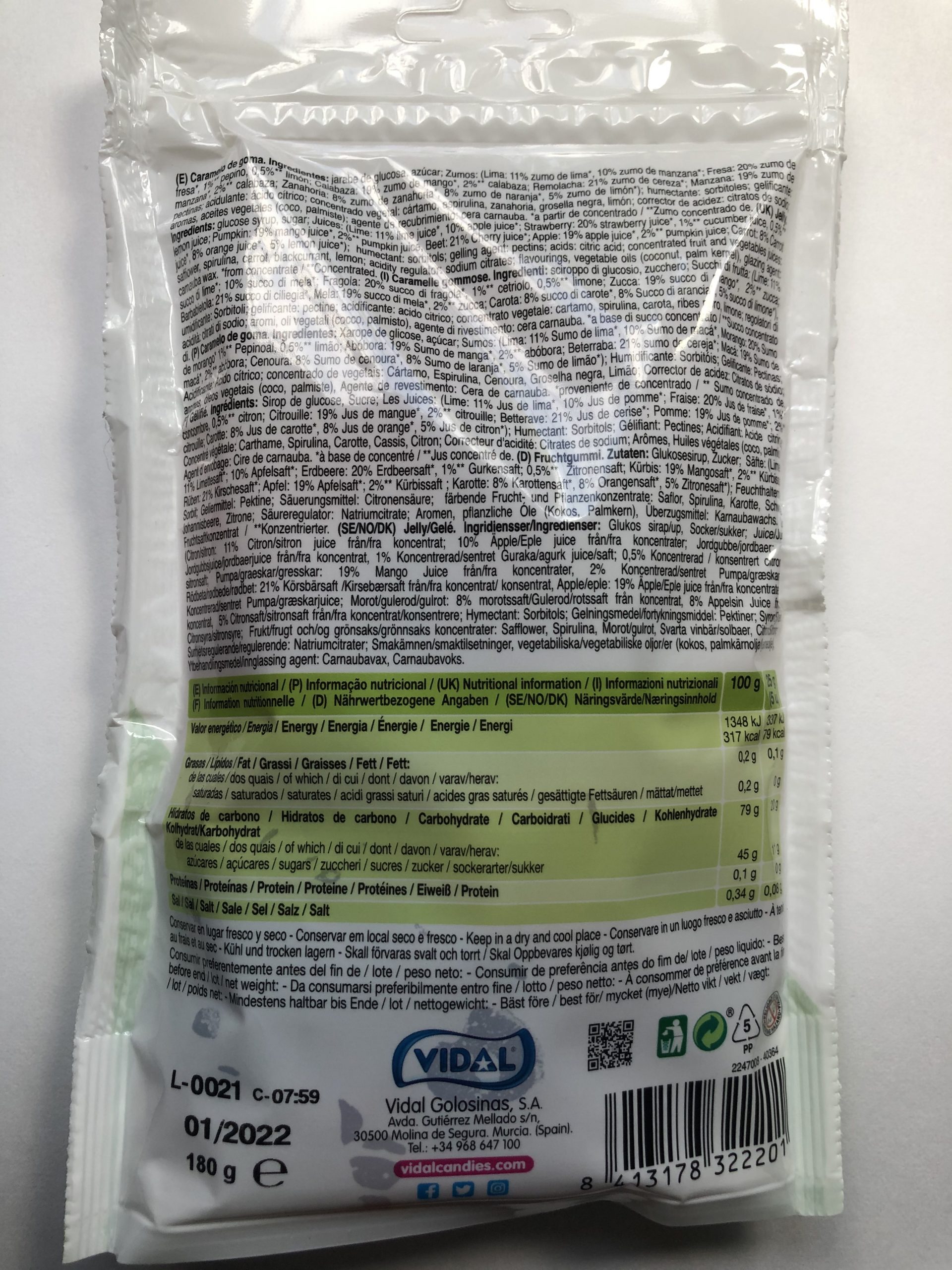 - INGREDIENTES: jarabe de glucosa, azúcar; Humectante: sorbitoles, 5% zumo de manzana a partir de concentrado, 3% Zumo de cereza a partir de concentrado, 3% zumo de mango a partir de concentrado, 3% zumo de fresa a partir de concentrado; Gelificante: pectinas, 1% zumo de lima a partir de concentrado, 1% Zumo de zanahoria a partir de concentrado, 1% zumo de naranja a partir de concentrado; acidulante: ácido cítrico, 0% zumo de limón a partir de concentrado, 0% Zumo concentrado de calabaza; Concentrado vegetal: círtamo, espirulina, zanahoria, grosella negra, limón; Corrector de acidez: citratos de sodio, aromas, aceites vegetales (palma, palmiste), 0% zumo concentrado de pepino; Agente de recubrimiento: cera carnauba, 0% zumo concentrado de limón