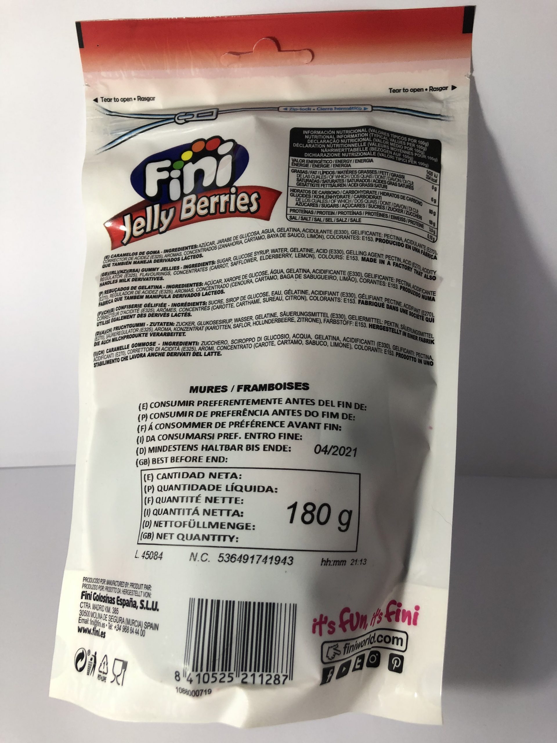 - Ingredientes: azúcar, jarabe de glucosa, agua, gelatina, dextrosa, acidulante: e330, gelificante: pectina, acidulante: e270, corrector de acidez: e325, aromas, concentrados de frutas y preparados de extractos vegetales (zanahoria negra, cartamo, baya de sauco, limón)