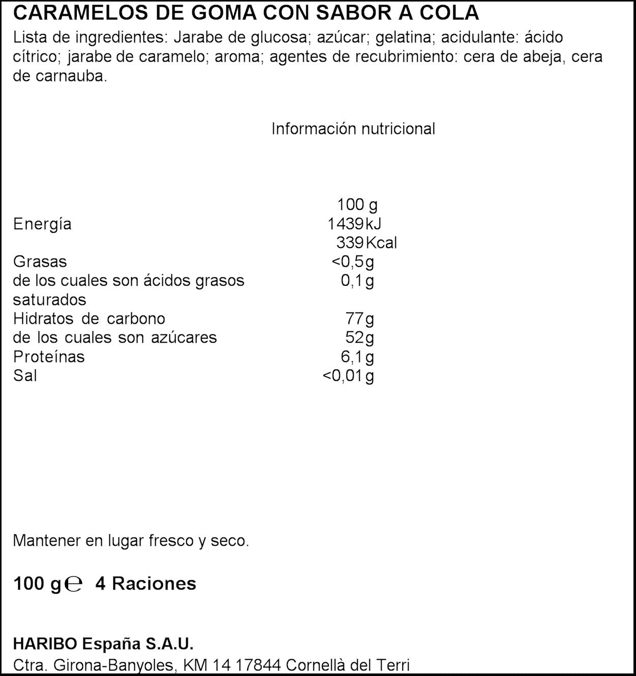 - Ingredientes: Jarabe de glucosa; azúcar; gelatina; acidulante: ácido cítrico; jarabe de caramelo; aroma; agentes de recubrimiento: cera de abeja blanca y amarilla, cera de carnauba.