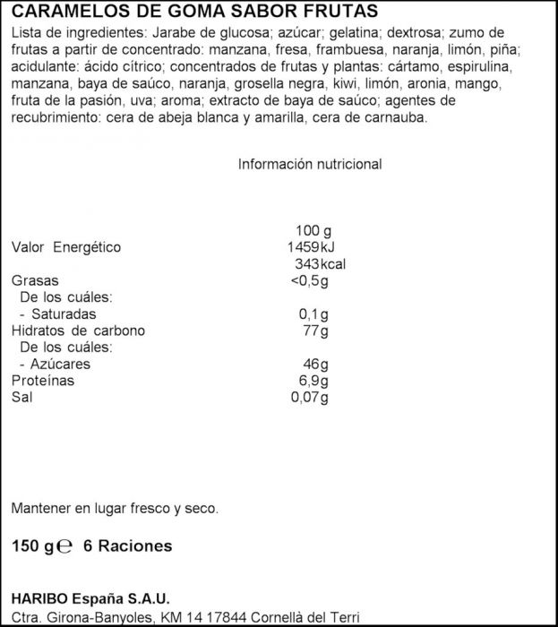 - Ingredientes y alérgenos: Jarabe de glucosa; azúcar; gelatina; dextrosa; zumo de frutas a partir de concentrado: manzana, fresa, frambuesa, naranja, limón, piña; acidulante: ácido cítrico; concentrados de frutas y plantas: cártamo, espirulina, manzana, baya de saúco, naranja, grosella negra, kiwi, limón, aronia, mango, fruta de la pasión, uva; aroma; extracto de baya de saúco; agentes de recubrimiento: cera de abeja blanca y amarilla, cera de carnauba.