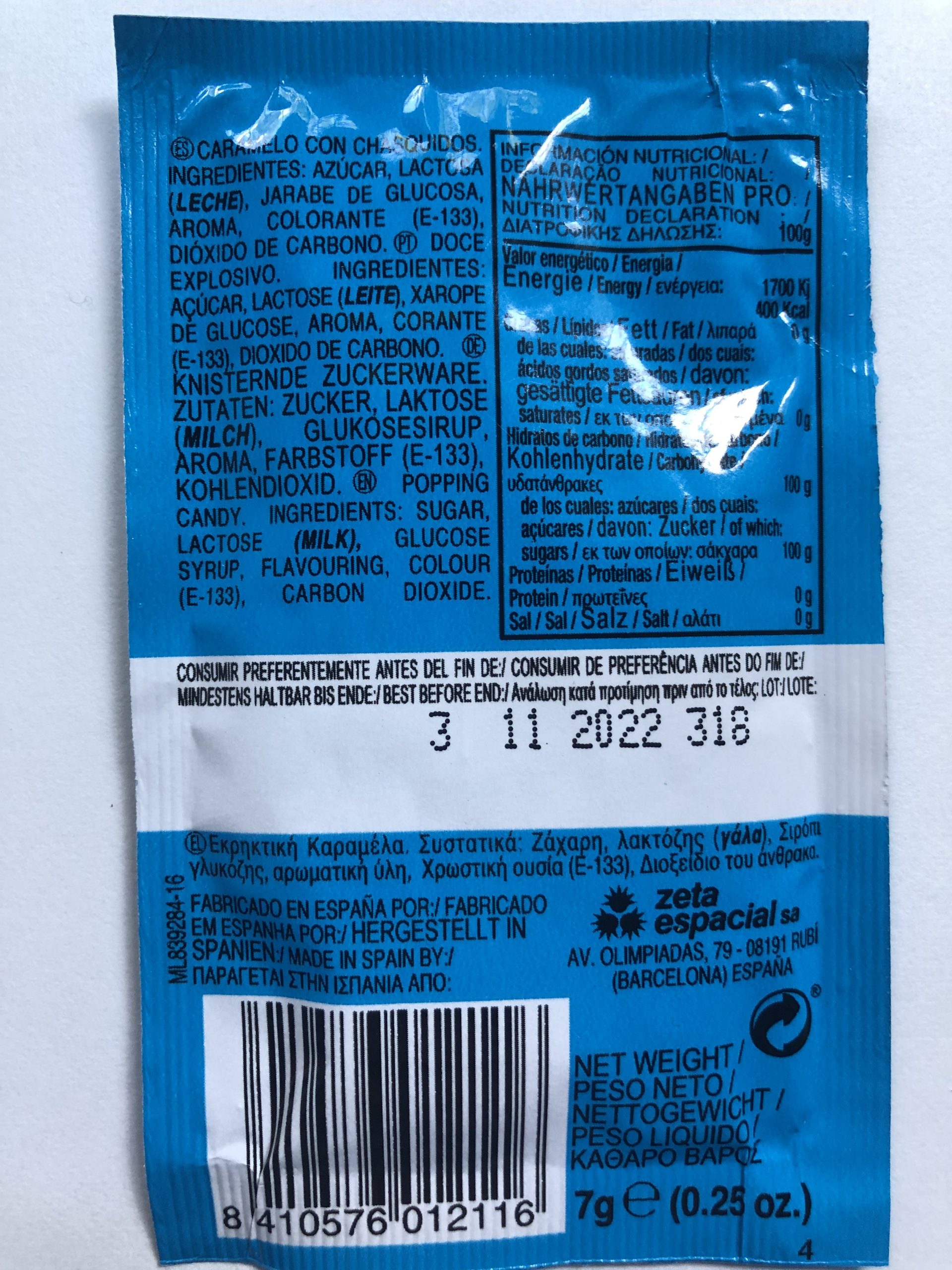 - Ingredientes: azúcar, lactosa, jarabe de glucosa, aroma, anhidrido carbonico E-290. Sin colorantes. 0g. 0g.