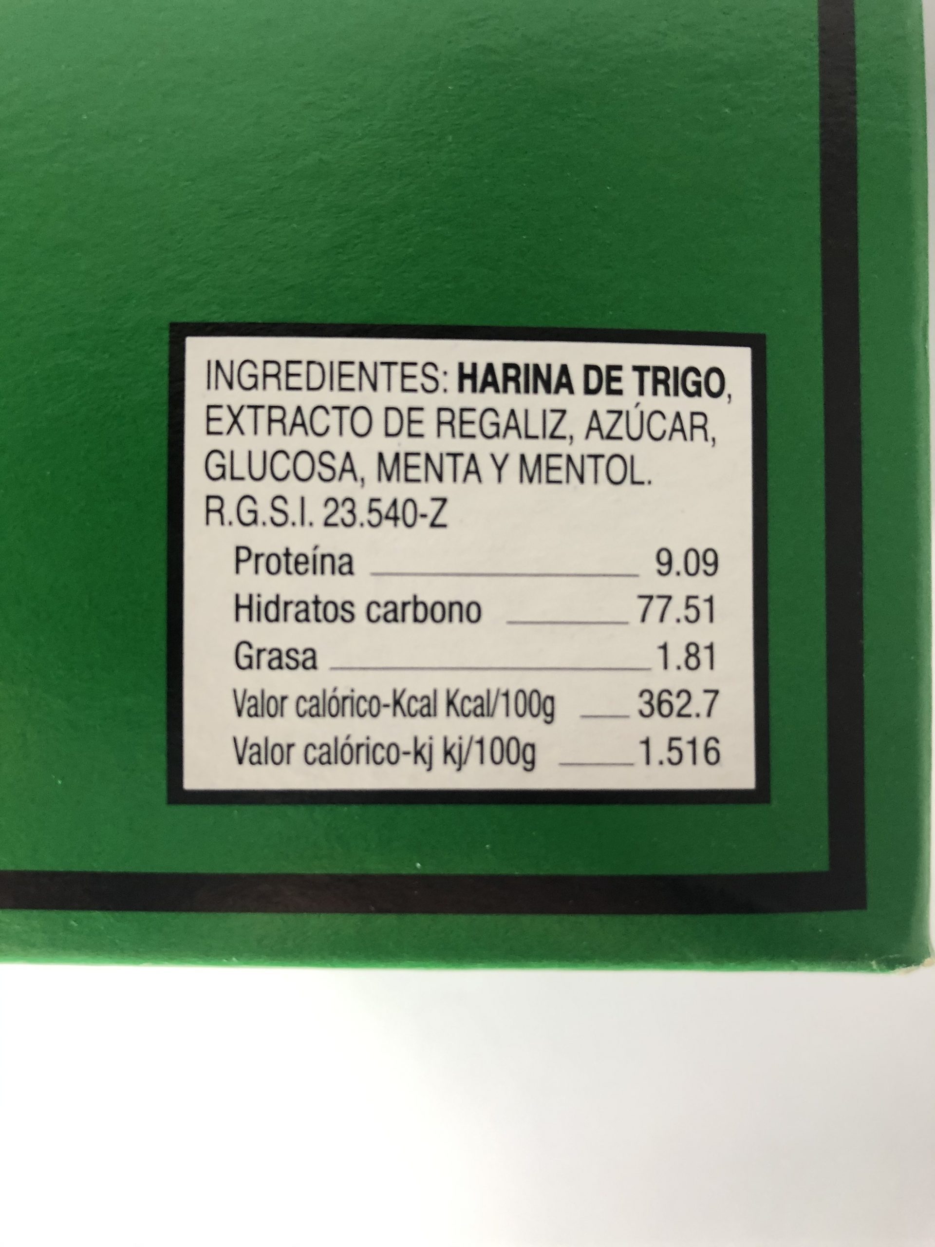 - Ingredientes: Harina de trigo, extracto de regaliz, azúcar, glucosa, menta y mentol. 1.81g. 77.51g. 9.09g.